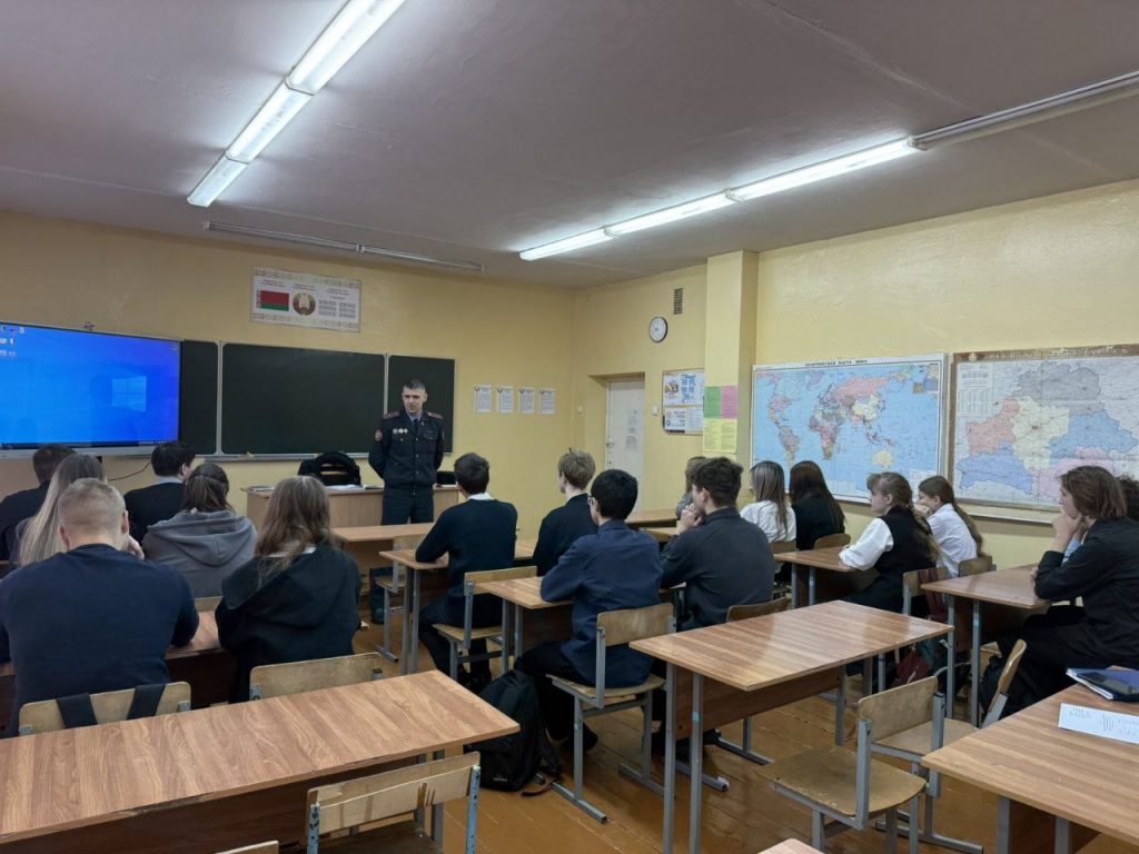 Гостем мероприятия стал Барановский С.Г., заместителем начальника ОГАИ ОВД Жлобинского РИК, который подробно рассказал о службе в органах внутренних дел и специфике работы сотрудников ГАИ. В ходе встречи гость агитировал учащихся к поступлению в вузы МВД, познакомил с условиями обучения, требованиями к абитуриентам и перспективами дальнейшей службы.