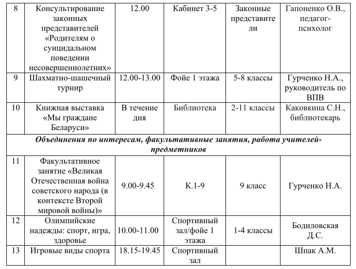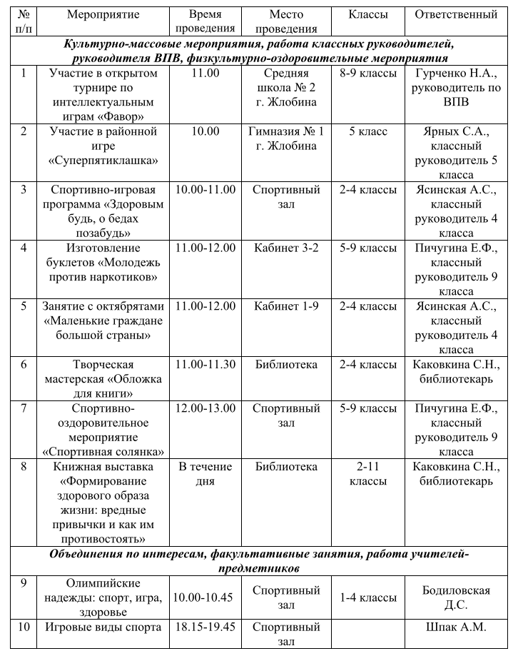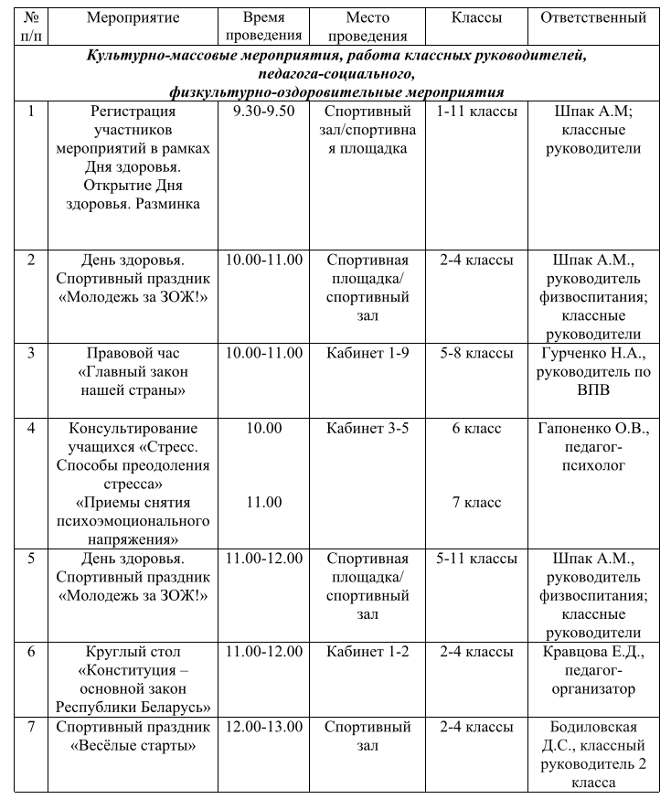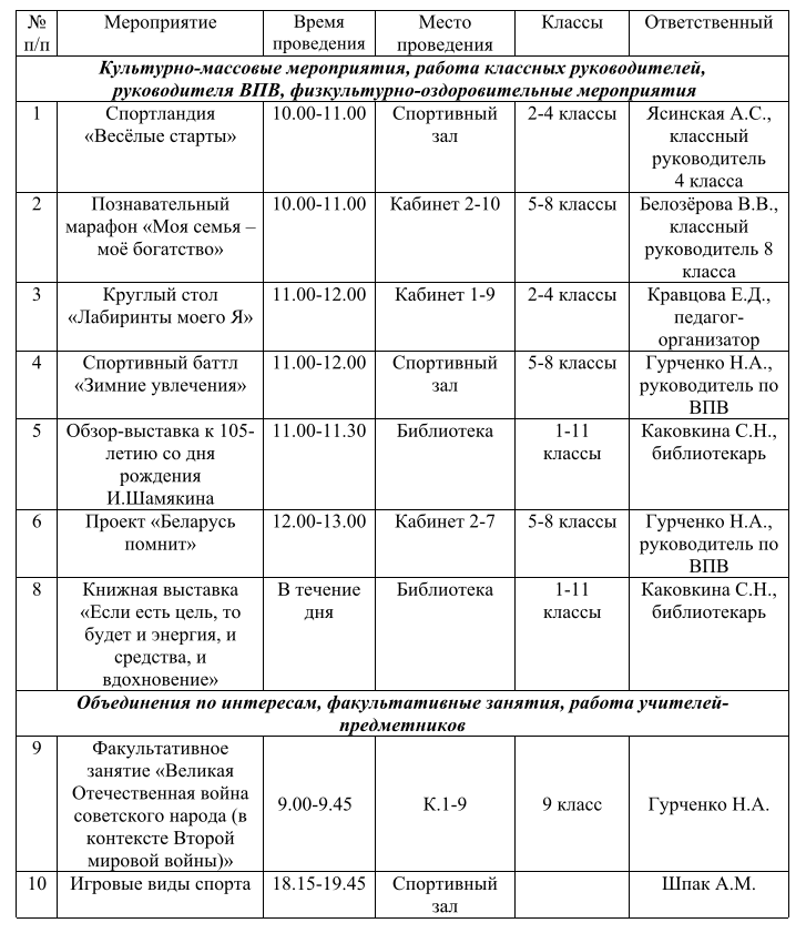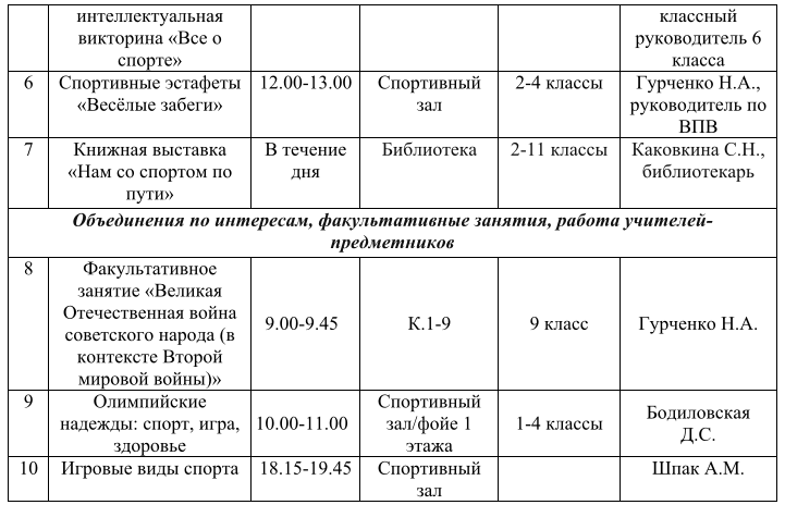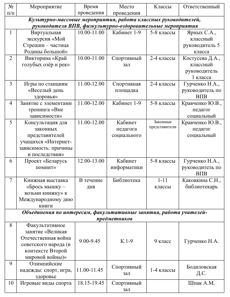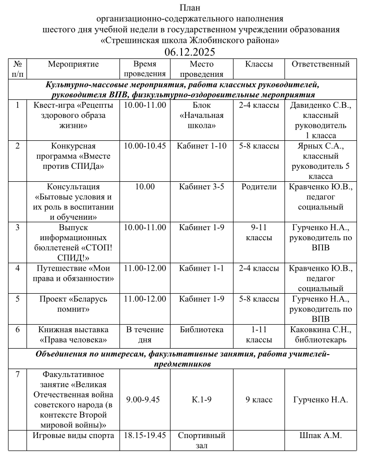 План организационно-содержательного наполнения шестого дня учебной недели в государственном учреждении образования «Стрешинская школа Жлобинского района» 06.09.2025 План организационно-содержательного наполнения шестого дня учебной недели в государственном учреждении образования «Стрешинская школа Жлобинского района» 13.09.2025 День здоровья План организационно-содержательного наполнения шестого дня учебной недели в государственном учреждении образования «Стрешинская школа Жлобинского района» 20.09.2025 План организационно-содержательного наполнения шестого дня учебной недели в государственном учреждении образования «Стрешинская школа Жлобинского района» 27.09.2025 План организационно-содержательного наполнения шестого дня учебной недели в государственном учреждении образования «Стрешинская школа Жлобинского района» 04.10.2025 План организационно-содержательного наполнения шестого дня учебной недели в государственном учреждении образования «Стрешинская школа Жлобинского района» 11.10.2025 День здоровья План организационно-содержательного наполнения шестого дня учебной недели в государственном учреждении образования «Стрешинская школа Жлобинского района» 18.10.2025 План организационно-содержательного наполнения шестого дня учебной недели в государственном учреждении образования «Стрешинская школа Жлобинского района» 25.10.2025 План организационно-содержательного наполнения шестого дня учебной недели в государственном учреждении образования «Стрешинская школа Жлобинского района» 15.11.2025 День здоровья План организационно-содержательного наполнения шестого дня учебной недели в государственном учреждении образования «Стрешинская школа Жлобинского района» 22.11.2025 План организационно-содержательного наполнения шестого дня учебной недели в государственном учреждении образования «Стрешинская школа Жлобинского района» 29.11.2025 План организационно-содержательного наполнения шестого дня учебной недели в государственном учреждении образования «Стрешинская школа Жлобинского района» 06.12.2025 План организационно-содержательного наполнения шестого дня учебной недели в государственном учреждении образования «Стрешинская школа Жлобинского района» 13.12.2025 День здоровья План организационно-содержательного наполнения шестого дня учебной недели в государственном учреждении образования «Стрешинская школа Жлобинского района» 20.12.2025 План организационно-содержательного наполнения шестого дня учебной недели в государственном учреждении образования «Стрешинская школа Жлобинского района» 17.01.2026 План организационно-содержательного наполнения шестого дня учебной недели в государственном учреждении образования «Стрешинская школа Жлобинского района» 24.01.2026 План организационно-содержательного наполнения шестого дня учебной недели в государственном учреждении образования «Стрешинская школа Жлобинского района» 31.01.2026 План организационно-содержательного наполнения шестого дня учебной недели в государственном учреждении образования «Стрешинская школа Жлобинского района» 07.02.2026 План организационно-содержательного наполнения шестого дня учебной недели в государственном учреждении образования «Стрешинская школа Жлобинского района» 14.02.2026 День здоровья План организационно-содержательного наполнения шестого дня 