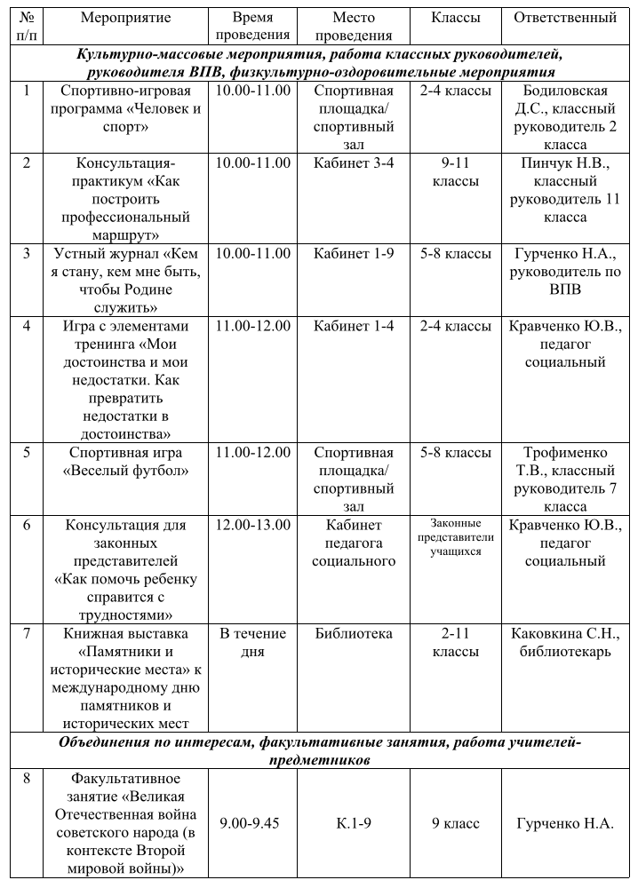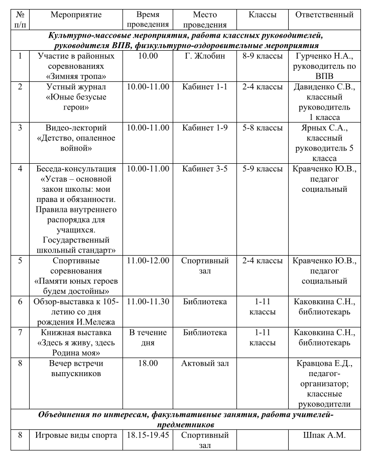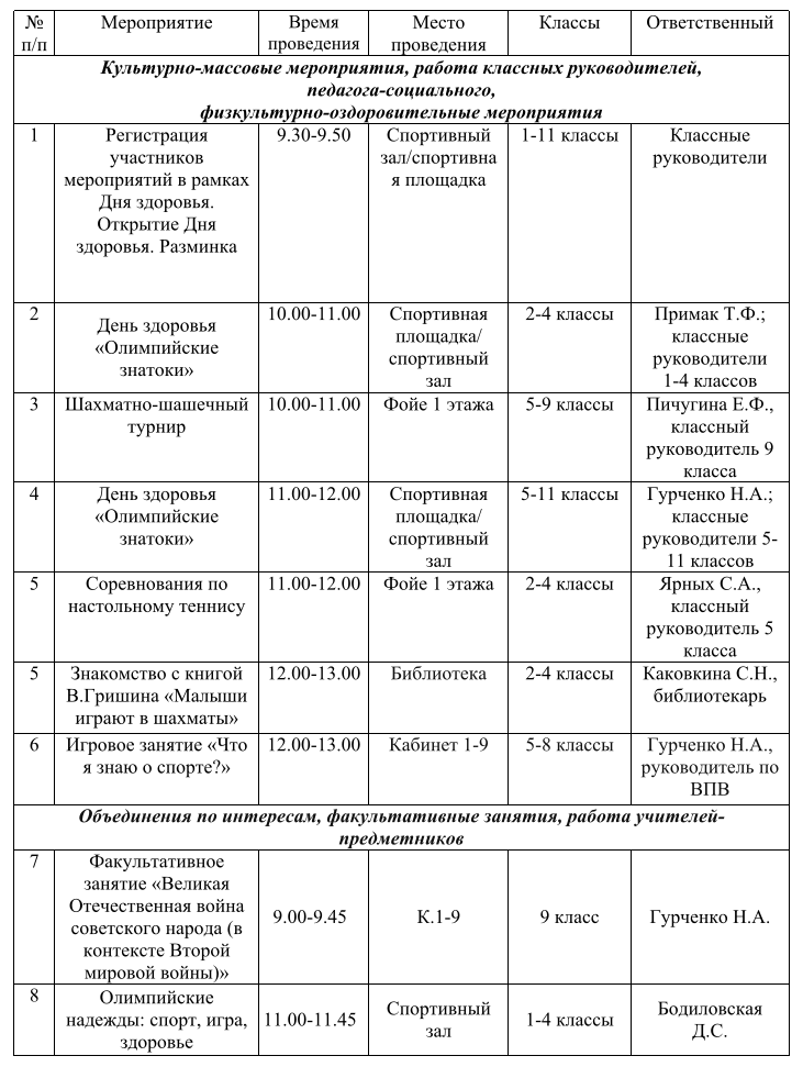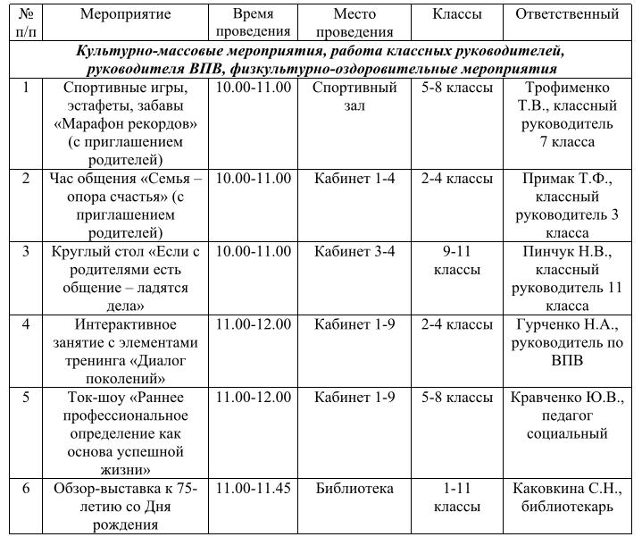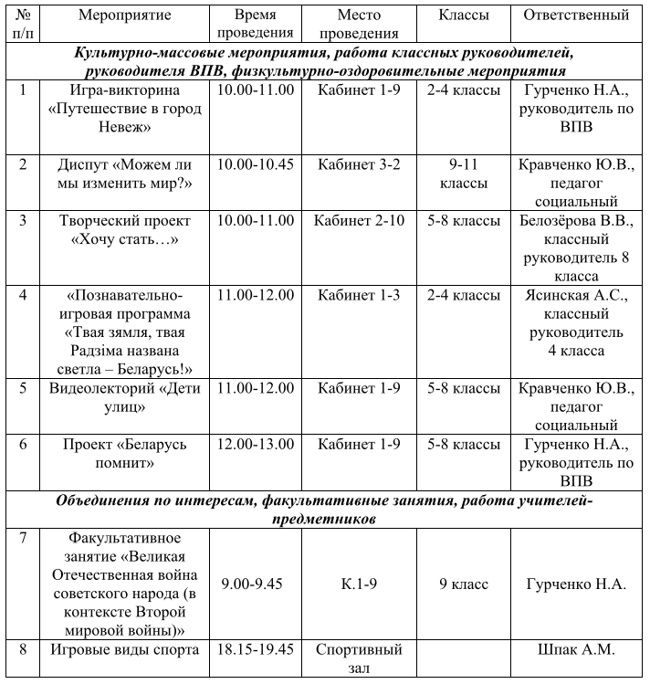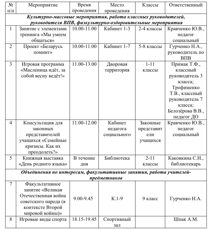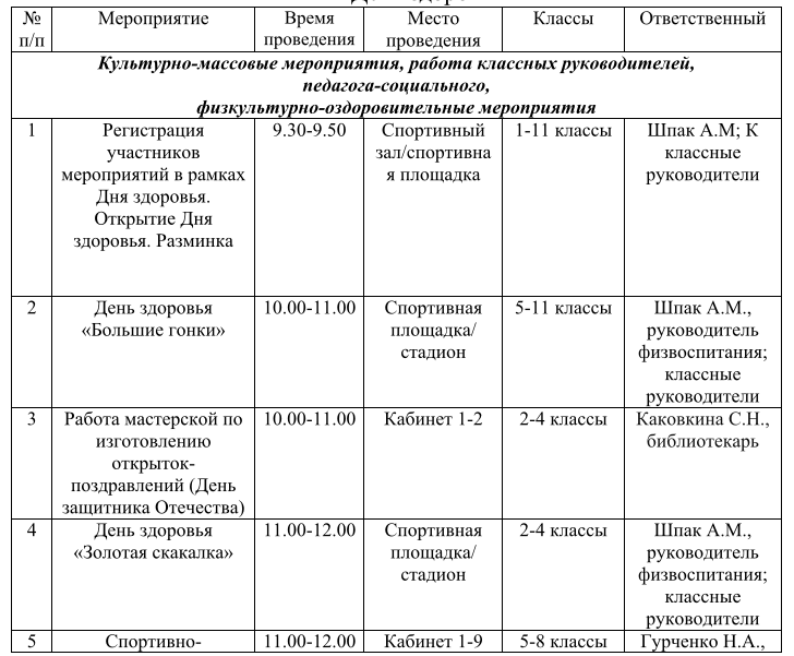 План организационно-содержательного наполнения шестого дня учебной недели в государственном учреждении образования «Стрешинская школа Жлобинского района» 06.09.2025 План организационно-содержательного наполнения шестого дня учебной недели в государственном учреждении образования «Стрешинская школа Жлобинского района» 13.09.2025 День здоровья План организационно-содержательного наполнения шестого дня учебной недели в государственном учреждении образования «Стрешинская школа Жлобинского района» 20.09.2025 План организационно-содержательного наполнения шестого дня учебной недели в государственном учреждении образования «Стрешинская школа Жлобинского района» 27.09.2025 План организационно-содержательного наполнения шестого дня учебной недели в государственном учреждении образования «Стрешинская школа Жлобинского района» 04.10.2025 План организационно-содержательного наполнения шестого дня учебной недели в государственном учреждении образования «Стрешинская школа Жлобинского района» 11.10.2025 День здоровья План организационно-содержательного наполнения шестого дня учебной недели в государственном учреждении образования «Стрешинская школа Жлобинского района» 18.10.2025 План организационно-содержательного наполнения шестого дня учебной недели в государственном учреждении образования «Стрешинская школа Жлобинского района» 25.10.2025 План организационно-содержательного наполнения шестого дня учебной недели в государственном учреждении образования «Стрешинская школа Жлобинского района» 15.11.2025 День здоровья План организационно-содержательного наполнения шестого дня учебной недели в государственном учреждении образования «Стрешинская школа Жлобинского района» 22.11.2025 План организационно-содержательного наполнения шестого дня учебной недели в государственном учреждении образования «Стрешинская школа Жлобинского района» 29.11.2025 План организационно-содержательного наполнения шестого дня учебной недели в государственном учреждении образования «Стрешинская школа Жлобинского района» 06.12.2025 План организационно-содержательного наполнения шестого дня учебной недели в государственном учреждении образования «Стрешинская школа Жлобинского района» 13.12.2025 День здоровья План организационно-содержательного наполнения шестого дня учебной недели в государственном учреждении образования «Стрешинская школа Жлобинского района» 20.12.2025 План организационно-содержательного наполнения шестого дня учебной недели в государственном учреждении образования «Стрешинская школа Жлобинского района» 17.01.2026 План организационно-содержательного наполнения шестого дня учебной недели в государственном учреждении образования «Стрешинская школа Жлобинского района» 24.01.2026 План организационно-содержательного наполнения шестого дня учебной недели в государственном учреждении образования «Стрешинская школа Жлобинского района» 31.01.2026 План организационно-содержательного наполнения шестого дня учебной недели в государственном учреждении образования «Стрешинская школа Жлобинского района» 07.02.2026 План организационно-содержательного наполнения шестого дня учебной недели в государственном учреждении образования «Стрешинская школа Жлобинского района» 14.02.2026 День здоровья План организационно-содержательного наполнения шестого дня 