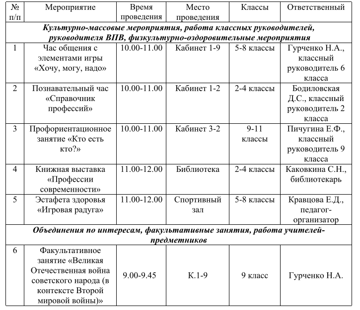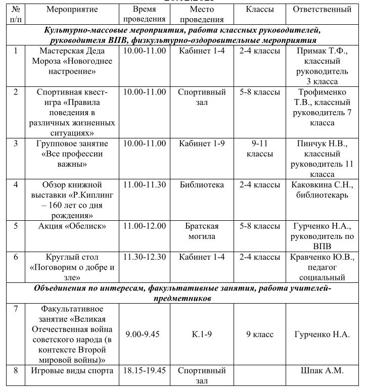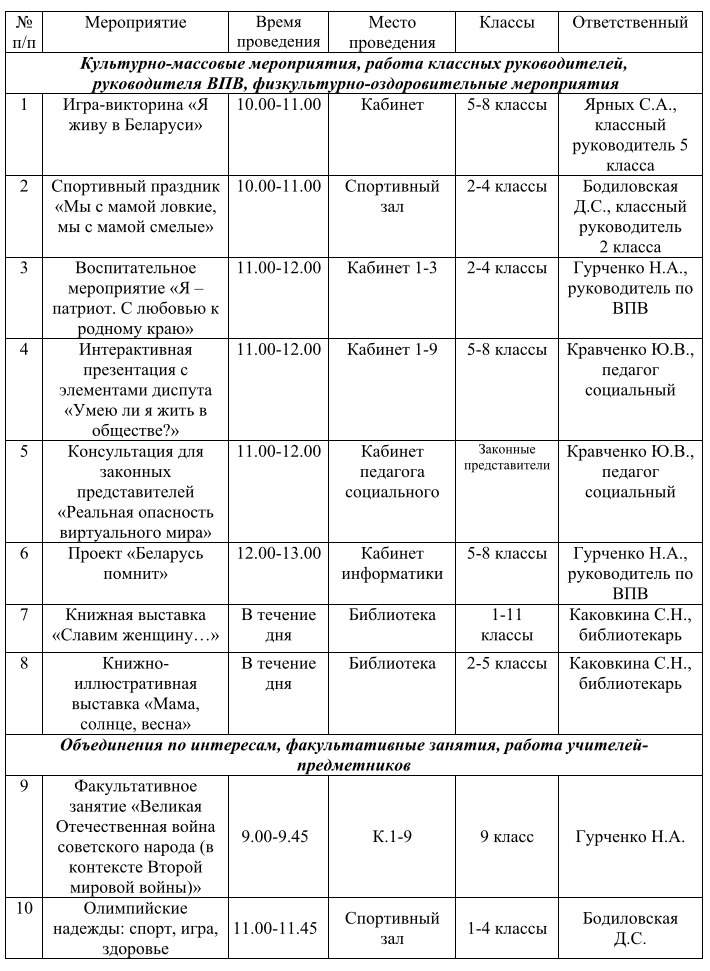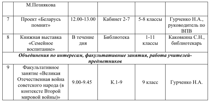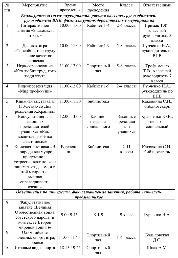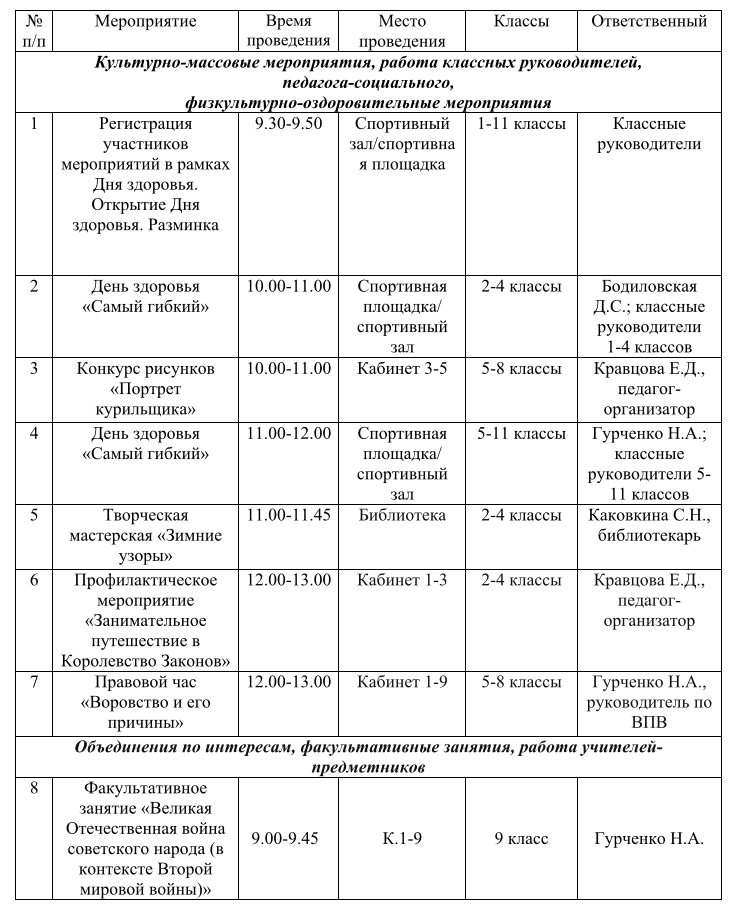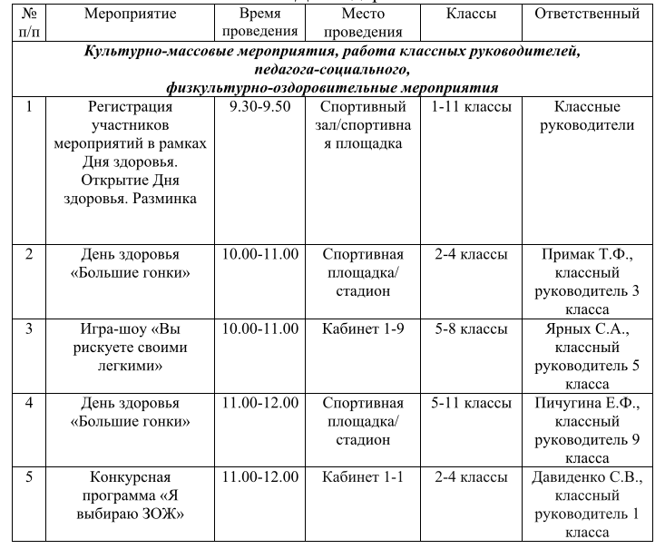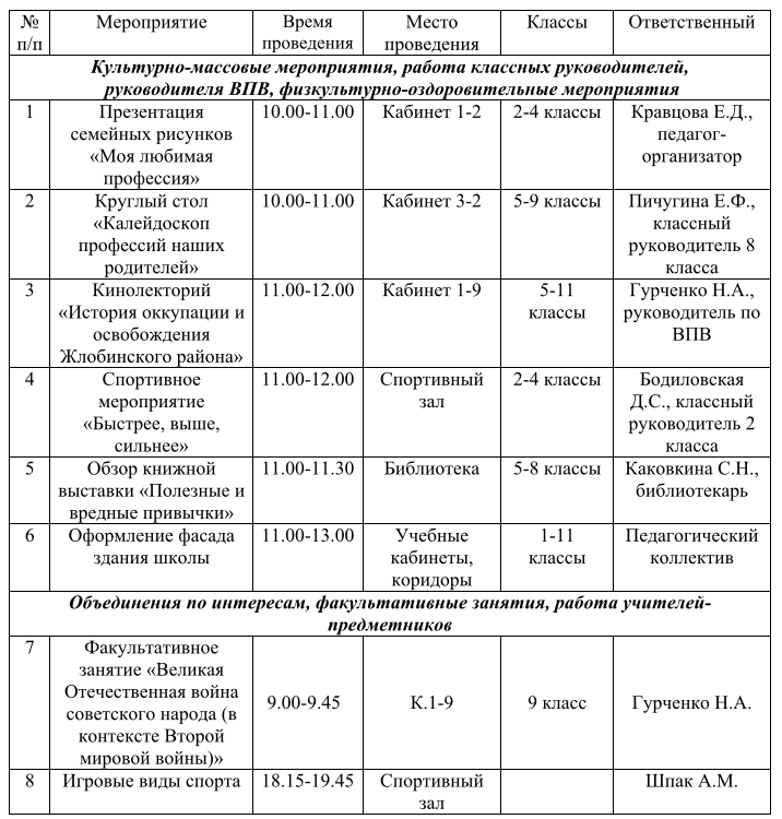 План организационно-содержательного наполнения шестого дня учебной недели в государственном учреждении образования «Стрешинская школа Жлобинского района» 06.09.2025 План организационно-содержательного наполнения шестого дня учебной недели в государственном учреждении образования «Стрешинская школа Жлобинского района» 13.09.2025 День здоровья План организационно-содержательного наполнения шестого дня учебной недели в государственном учреждении образования «Стрешинская школа Жлобинского района» 20.09.2025 План организационно-содержательного наполнения шестого дня учебной недели в государственном учреждении образования «Стрешинская школа Жлобинского района» 27.09.2025 План организационно-содержательного наполнения шестого дня учебной недели в государственном учреждении образования «Стрешинская школа Жлобинского района» 04.10.2025 План организационно-содержательного наполнения шестого дня учебной недели в государственном учреждении образования «Стрешинская школа Жлобинского района» 11.10.2025 День здоровья План организационно-содержательного наполнения шестого дня учебной недели в государственном учреждении образования «Стрешинская школа Жлобинского района» 18.10.2025 План организационно-содержательного наполнения шестого дня учебной недели в государственном учреждении образования «Стрешинская школа Жлобинского района» 25.10.2025 План организационно-содержательного наполнения шестого дня учебной недели в государственном учреждении образования «Стрешинская школа Жлобинского района» 15.11.2025 День здоровья План организационно-содержательного наполнения шестого дня учебной недели в государственном учреждении образования «Стрешинская школа Жлобинского района» 22.11.2025 План организационно-содержательного наполнения шестого дня учебной недели в государственном учреждении образования «Стрешинская школа Жлобинского района» 29.11.2025 План организационно-содержательного наполнения шестого дня учебной недели в государственном учреждении образования «Стрешинская школа Жлобинского района» 06.12.2025 План организационно-содержательного наполнения шестого дня учебной недели в государственном учреждении образования «Стрешинская школа Жлобинского района» 13.12.2025 День здоровья План организационно-содержательного наполнения шестого дня учебной недели в государственном учреждении образования «Стрешинская школа Жлобинского района» 20.12.2025 План организационно-содержательного наполнения шестого дня учебной недели в государственном учреждении образования «Стрешинская школа Жлобинского района» 17.01.2026 План организационно-содержательного наполнения шестого дня учебной недели в государственном учреждении образования «Стрешинская школа Жлобинского района» 24.01.2026 План организационно-содержательного наполнения шестого дня учебной недели в государственном учреждении образования «Стрешинская школа Жлобинского района» 31.01.2026 План организационно-содержательного наполнения шестого дня учебной недели в государственном учреждении образования «Стрешинская школа Жлобинского района» 07.02.2026 План организационно-содержательного наполнения шестого дня учебной недели в государственном учреждении образования «Стрешинская школа Жлобинского района» 14.02.2026 День здоровья План организационно-содержательного наполнения шестого дня 