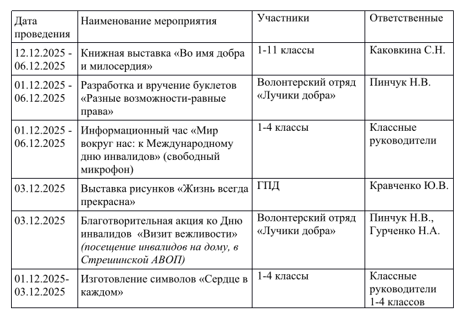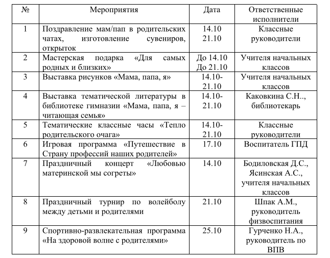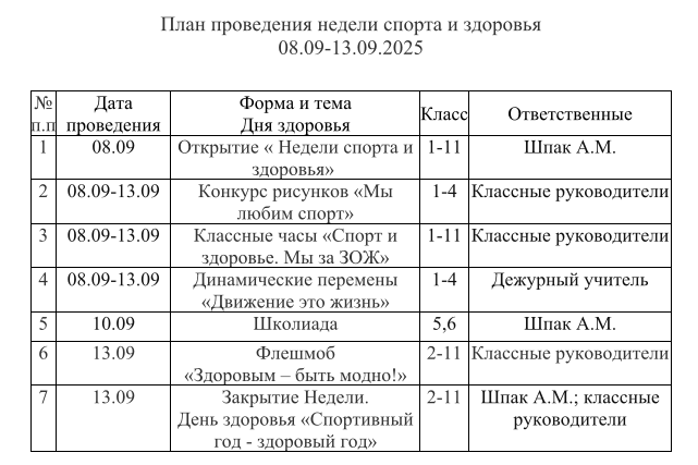 План проведения недели спорта и здоровья 08.09-13.09.2025 Неделя родительской любви, приуроченная к празднованию Дня матери и Дня отца Мероприятия ко Дню инвалидов