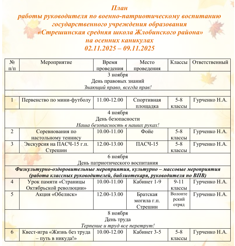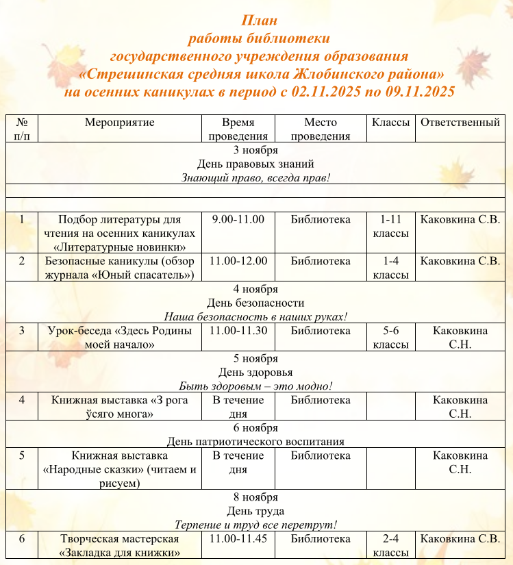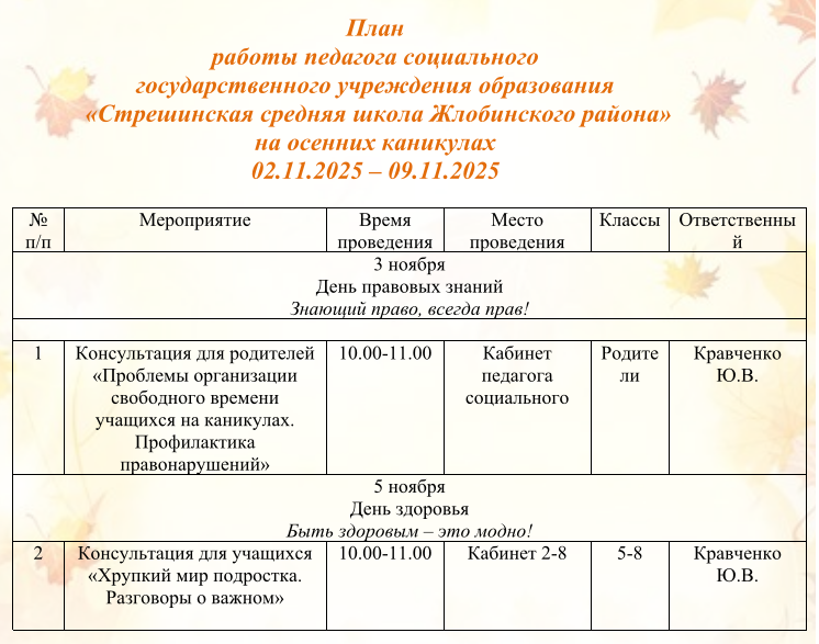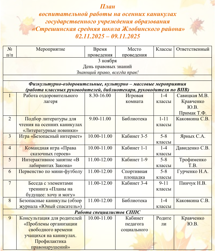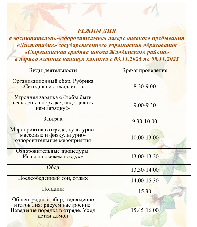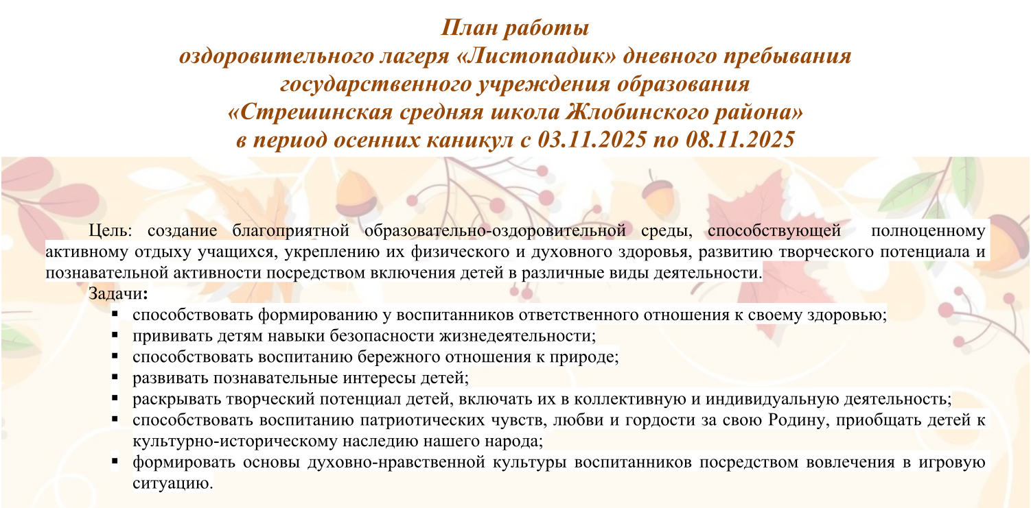 Оздоровительный лагерь дневного пребывания «Листопадик» План работы оздоровительного лагеря «Листопадик» РЕЖИМ ДНЯ в воспитательно-оздоровительном лагере дневного пребывания «Листопадик» Работа школы на осенних каникулах План воспитательной работы на осенних каникулах государственного учреждения образования «Стрешинская средняя школа Жлобинского района» 02.11.2025 – 09.11.2025