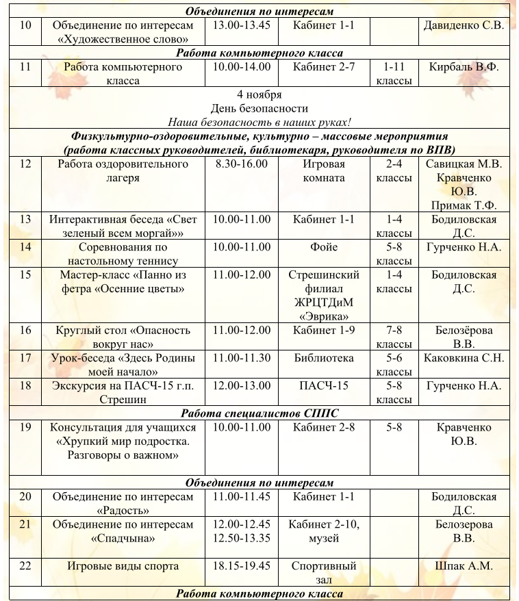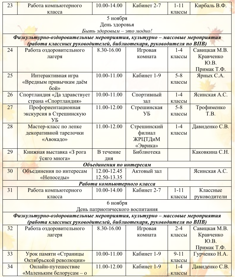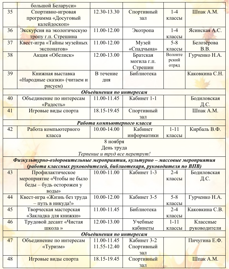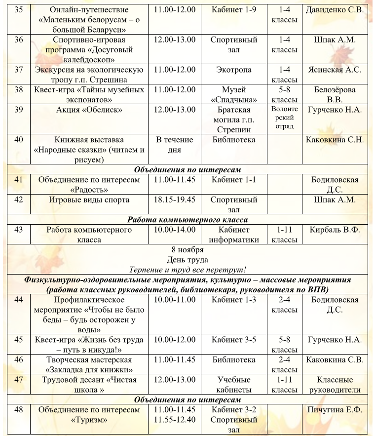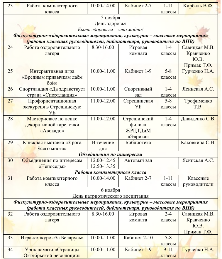 Оздоровительный лагерь дневного пребывания «Листопадик» План работы оздоровительного лагеря «Листопадик» РЕЖИМ ДНЯ в воспитательно-оздоровительном лагере дневного пребывания «Листопадик» Работа школы на осенних каникулах План воспитательной работы на осенних каникулах государственного учреждения образования «Стрешинская средняя школа Жлобинского района» 02.11.2025 – 09.11.2025